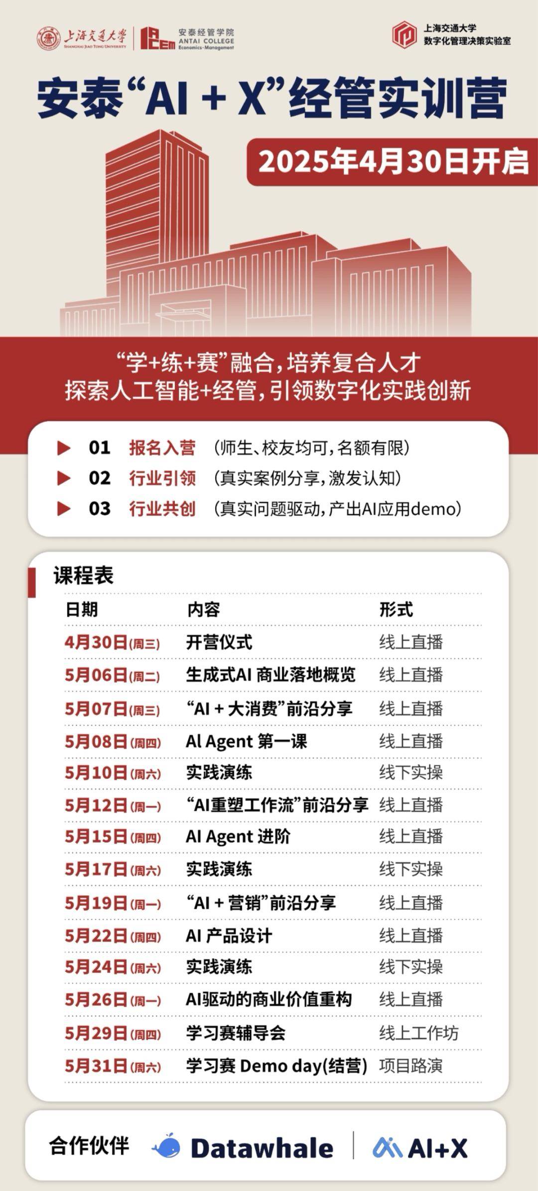 为用户供给愈加个性化的进修体验。4 月 30 日,Datawhale 结合举办的上海交大安泰AI+X经管实训营正式启动。最终发生一等 1 组、二等 3 组、三等 7 组及优胜 5 组。为供给项目实践和就业能力提拔机遇,