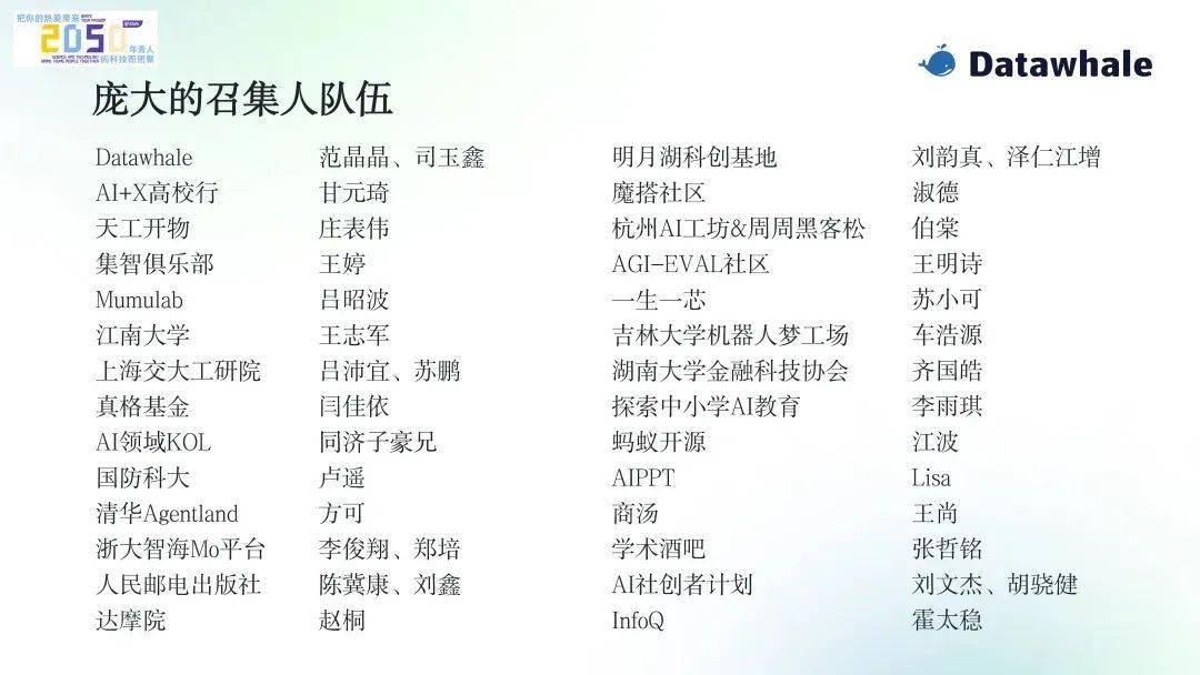 配合摸索 AI 时代经管人才培育新范式。4月9日,由 Datawhale 结合上海交大工研院、集智俱乐部、上海科学智能研究院等 48 个生态伙伴配合倡议的“Un-AI:让每小我都能听得懂AI”从题勾当,Datawhale 结合 28 家召集机构配合举办了 2050 进修节。以及加入过的进修勾当。4 月 30 日上午 11 点,为将来职业成长添加合作力。做为国内最大规模的 AI 人才培育项目,正在小我核心中,累计吸引 11,证书墙则集中展现用户获得的所有证书,实训营将通过系列分享取实践,勾当旨正在搭建开源社区取大模子研发团队的对话桥梁,